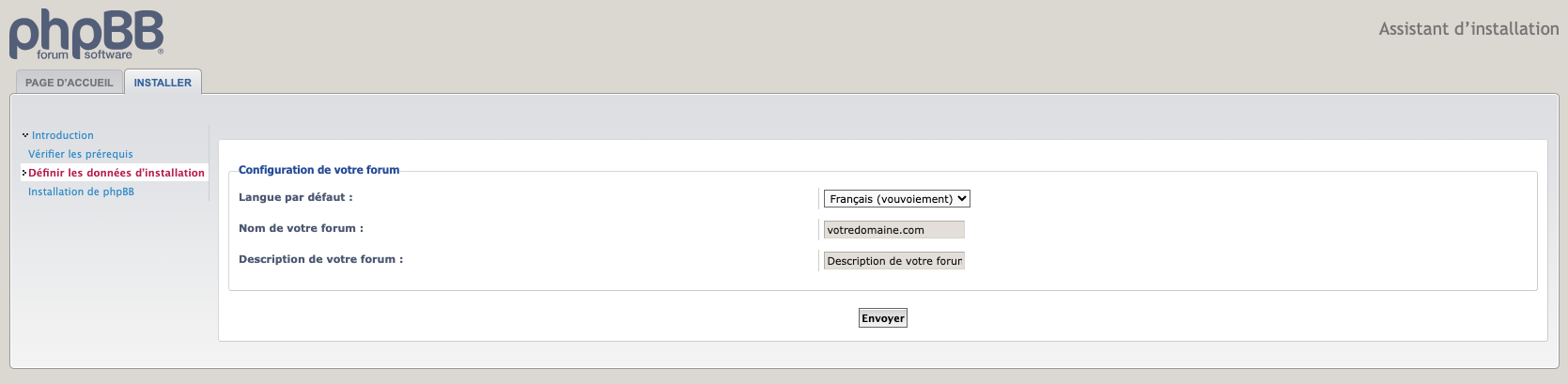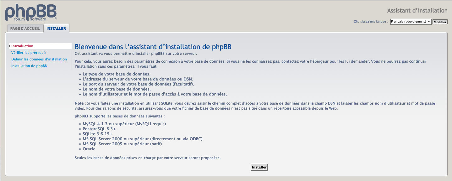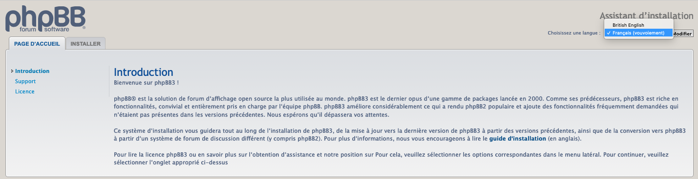 Une fois que tous les fichiers ont été téléchargés sur votre site, vous devez pointer votre navigateur à cet endroit avec l'ajout de /install. Par exemple, si votre nom de domaine est www.domaine.fr et que vous avez placé les fichiers phpBB dans le répertoire /phpBB3 de votre racine Web, vous saisirez http://www.domaine.fr/phpBB3/install/ ou (alternativement) http://www.domaine.fr/phpBB3/install/app.php dans votre navigateur. Lorsque vous avez fait cela, vous devriez voir apparaître l'écran d'introduction de phpBB.