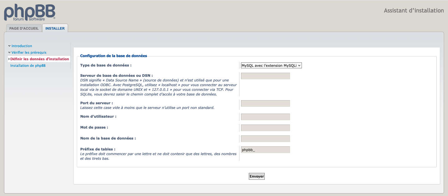 Après avoir créé la base de données, en règle général, vous recevez un e-mail de votre hébergeur avec vos informations de connexion à la base de données. Pour l'installation de phpBB il faudra connaitre ces informations :